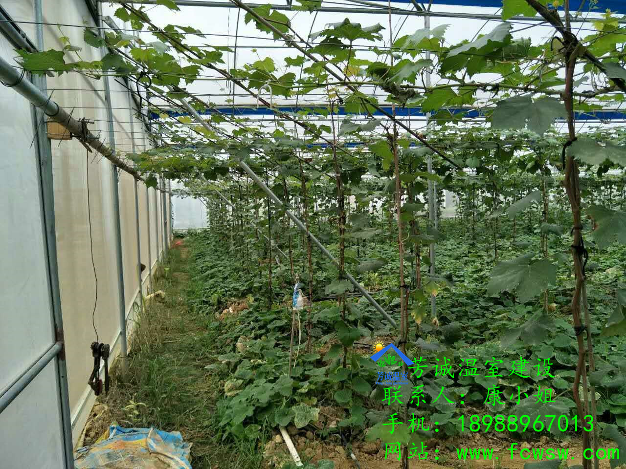 位于广东深圳光明新区锦绣田园的葡萄园,经过三个月的培育种植,葡萄已初见雏形,葡萄属于藤本植物,沿着立柱向上生长,植株间距宽,因此,地面很多杂草丛生,为了更好了利用土地,提高土地的利用率,园主种植了矮株植物香瓜。同块种植地,同个大棚,两种不同植物互利共生,既提供了产量,实现了利润最大化;又为其他种植户提供了成功的种植模式。大棚分为东西两个棚,中间是一个观景长廊,东棚作为种植棚,西棚作为采摘棚,园区各种基础设备,游乐设备日益完善,日后定能成为深圳市民田园游乐的好去处。